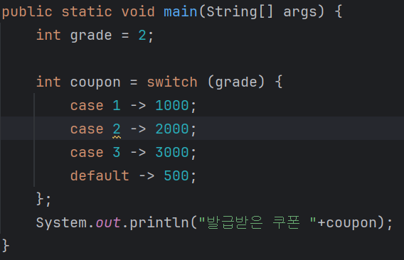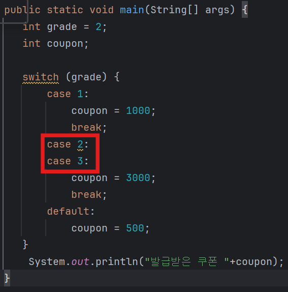2등급인 경우에도 3등급과 같이 3000 쿠폰을 발급하고 싶다면 case 2: 뒤에 오는 break;문을 삭제하면 된다.