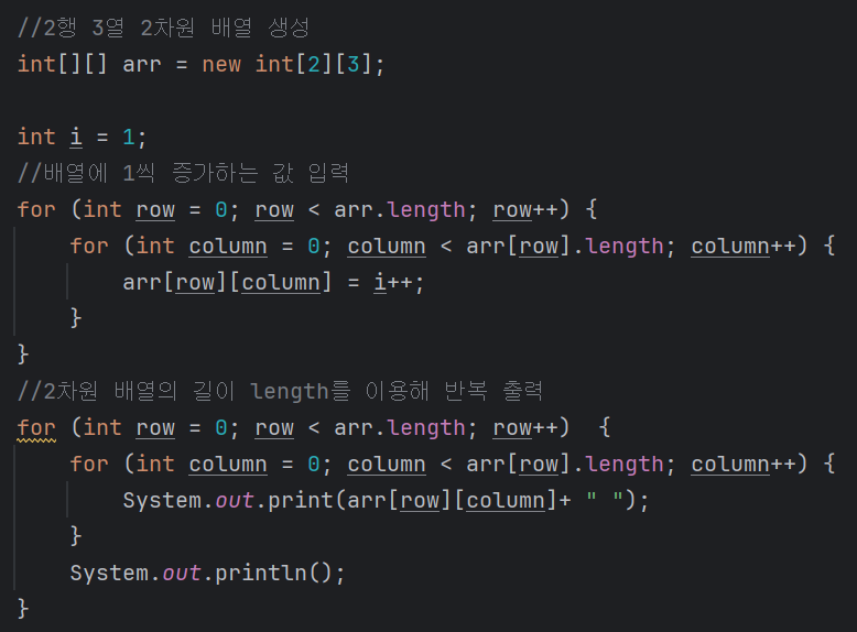 int [ ] [ ] arr = new int [2] [3]; 와 같이 1차원 배열에 [ ]를 하나 추가하여 선언할 수 있다.