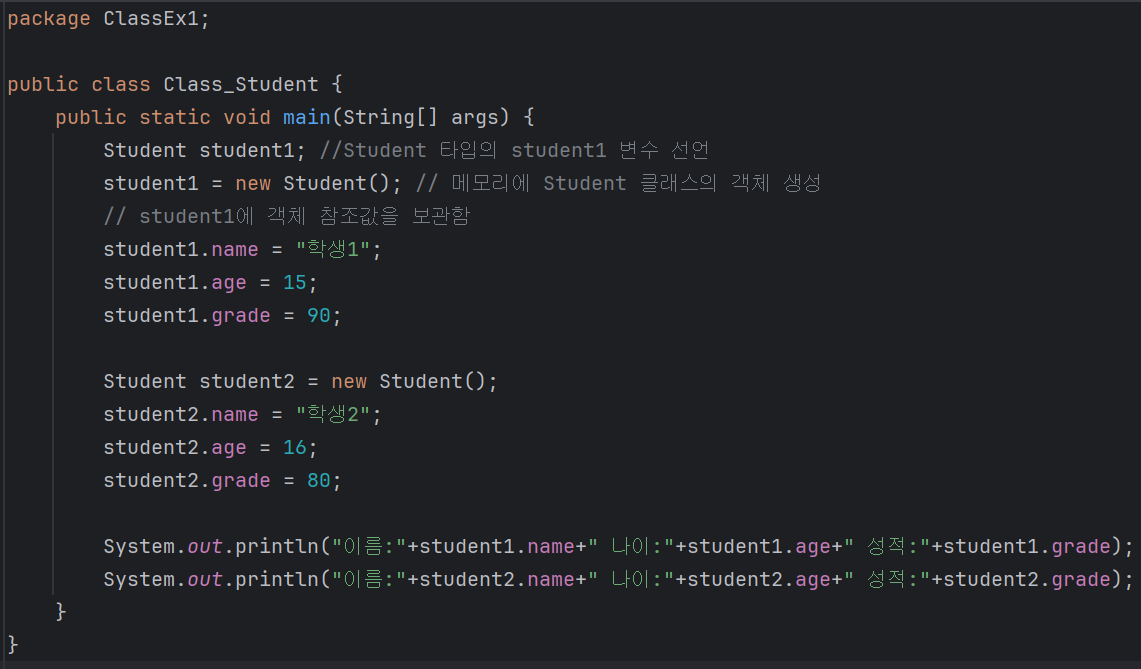 위에서 Student 클래스를 기반으로 만든 객체 student1과 student2를 사용하기 위해서는