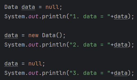 변수 data에 null값을 대입했으므로 우리가 위에서 생성했던 Data 인스턴스는 더 이상 아무도 참조하지 않게 된다.