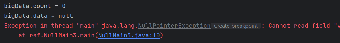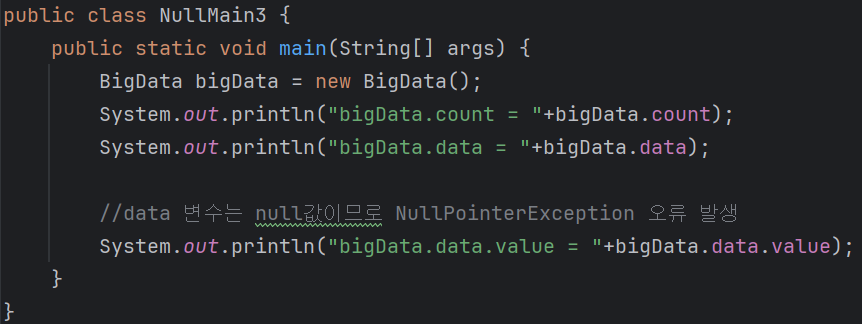 이 문제를해결하고 싶다면 BigData 클래스에서 data 멤버변수에 = New Data();를 붙여 참조값을 할당해 주면 된다.