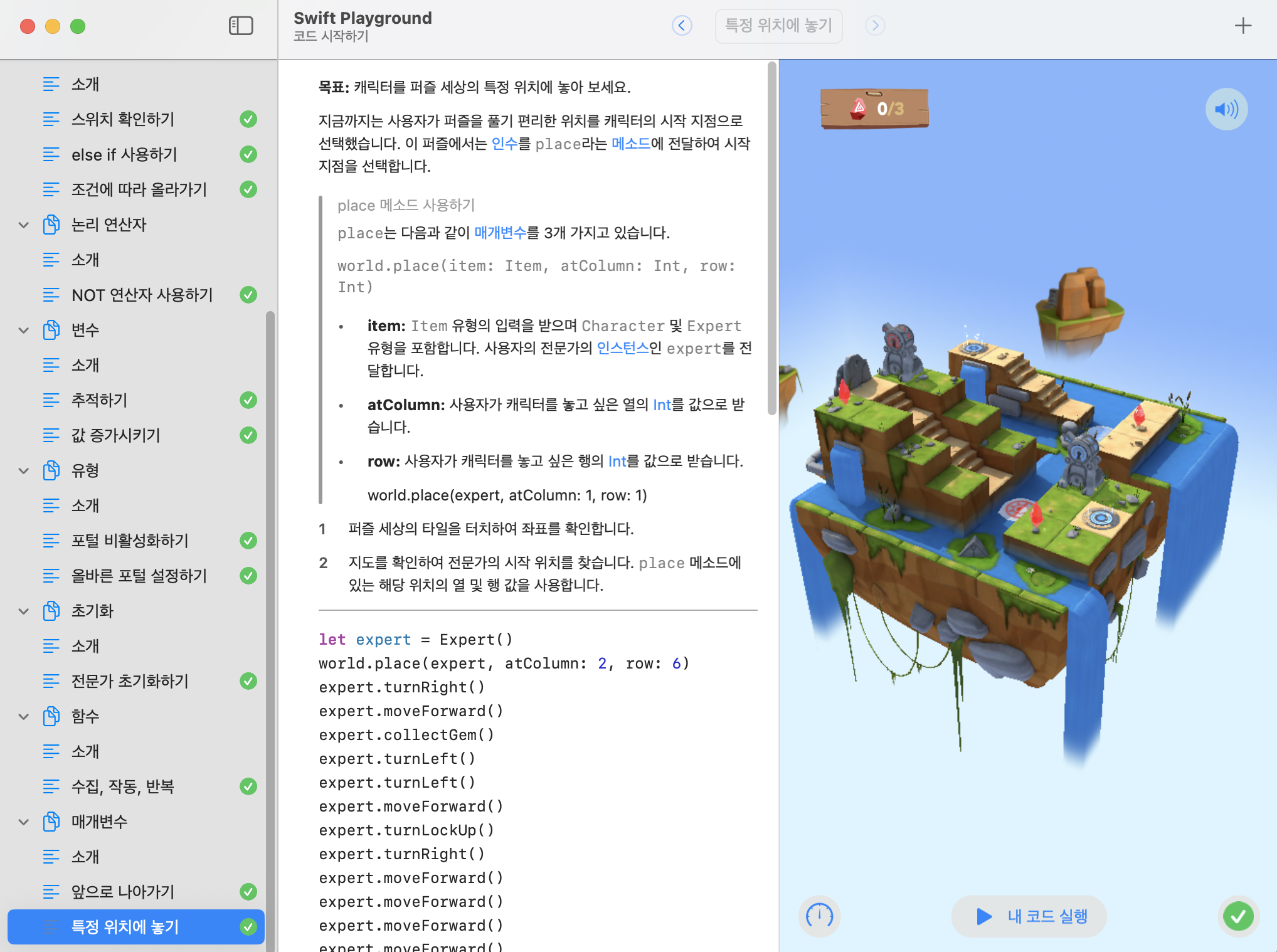 캐릭터를 이동시키고 보석을 수집하는 과정에서 자연스럽게 Swift 문법을 사용하게 되며, 변수·조건문·함수 같은 기본 개념을 직접 코드로 적용해 볼 수 있다.