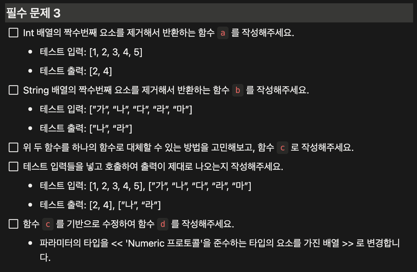 프로토콜 제약조건을 설정해서 제네릭에 사용할 수 있는 타입의 범위를 적절히 제한해 코드의 의도를 명확히 할 수 있다는 것이 이 문제의 출제 의도인 것 같다.