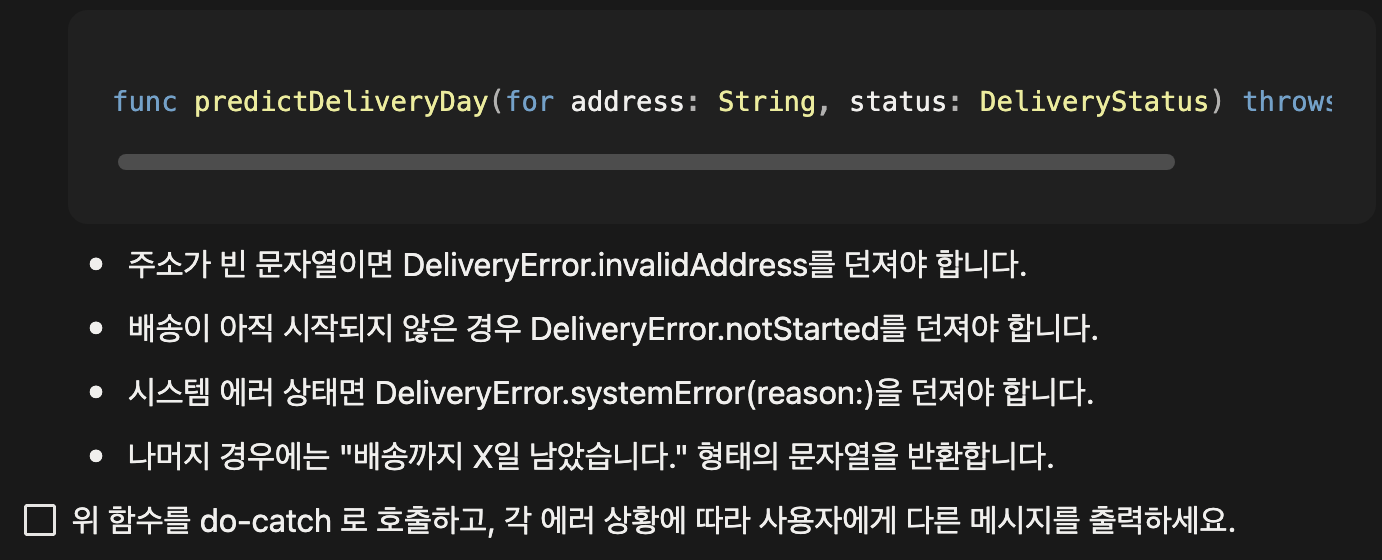 - 사용자 정의 에러 타입 DeliveryError를 Error 프로토콜을 따르도록 정의합니다.