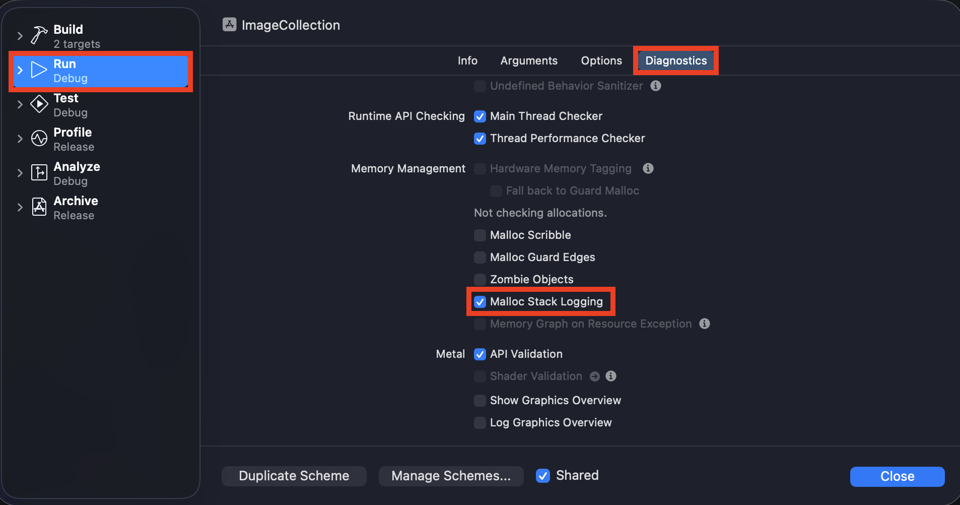 먼저 0단계로 Malloc Stack Logging 설정을 켜는 것을 추천한다. 이 설정이 꺼져 있어도 메모리 그래프는 볼 수 있지만, 켜두어야만 해당 메모리가 '코드의 몇 번째 줄'에서 생성되었는지 정확한 위치(Backtrace)를 추적할 수 있다.