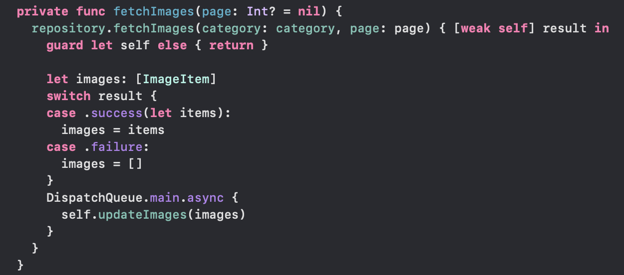 - 클로저 {...} 안에서 self.fetchImages()를 호출함