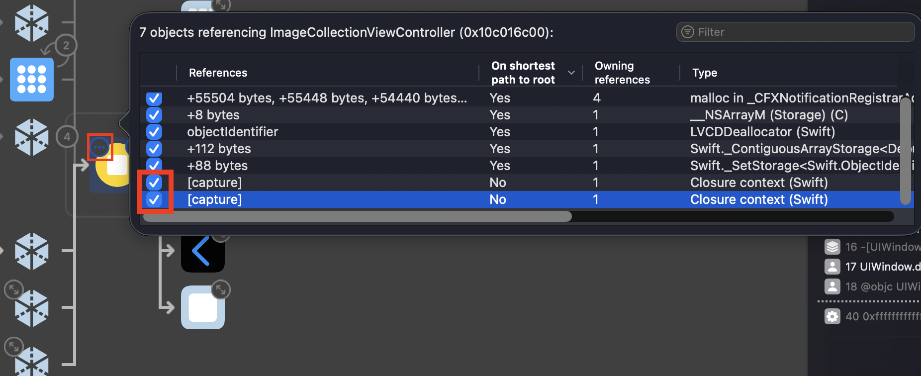 그래프에 [capture] 노드가 2개 보인다는 의미는 self를 캡처하는 클로저가 최소 2개로 [weak self]를 써주어서 누수를 고칠 수 있다.