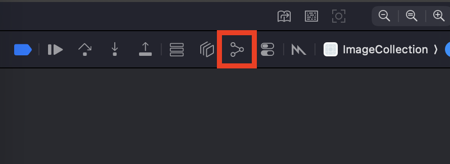 4. Xcode 하단 디버그 바에서 Memory Graph 버튼 클릭 (동그라미 세 개가 연결된 아이콘)